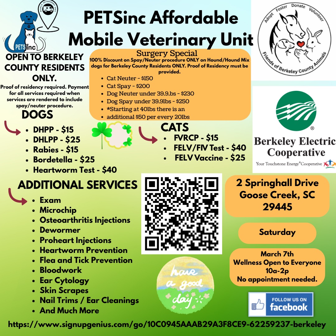 Through the Berkeley Paws Alliance Project we are able to prove low-cost spay/neuter, vaccinations, and wellness visits for Berkeley County residents only at this time. On a rotating basis a limited amount of hunting dogs or pit breeds will be discounted at 100%. Both dogs and cats are welcome for these wellness and vaccination visits. Walk-in appointments are available. Wellness visits, including vaccinations and blood work if desired will be available. Please verify arrival time and we encourage everyone to arrive on time and bring snacks, water, and a chair. Each animal is treated with care and some animals take longer than others but we kindly appreciate patience during these events.